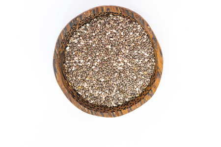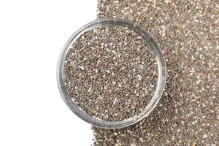 Healthy food, sources omega-3 - overhead view of chia seed isolated on white background