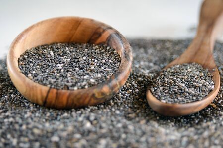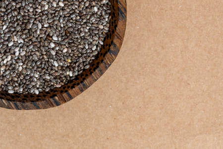 Edible seeds of chia, Salvia hispanica, a flowering plant of the mint family. Close-up. Chia seeds in a plate of natural olive wood. Product for beauty and health. Proper nutrition. Blurry.
