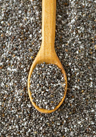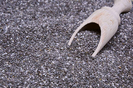 Black Chia seeds in a wooden spoon close-up. Macrophotography of Chia. Health food. Good nutrition. Nutritional Supplement.Top view.