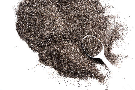 A heap of organic chia seeds - superfood, side view on white background. Healthy food.