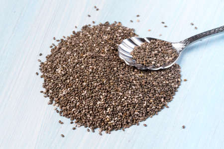 Organic food concept with healthy chia seeds in spoon on concrete background