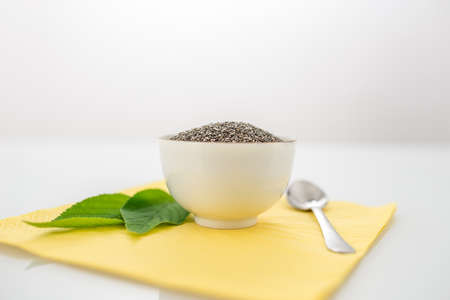 Bowl of healthy dried chia seeds from the Salvia hispanica plant rich in omega-3 fatty acids, dietary fiber and protein with fresh green leaves on a place mat, copyspace above.