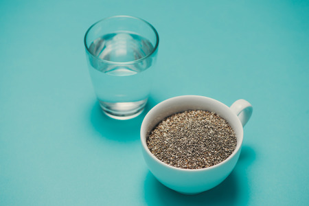 Chia seeds in bowl on colored background. Healthy Salvia hispanica in small bowl. Healthy superfood.