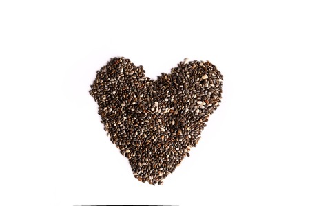 Healthy Chia seeds in a heart shaped bowl on a white background.