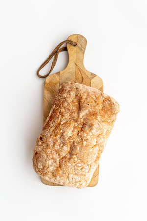 Sliced ciabatta bread on wooden cutting board isolated. Italian chiabatta loaf cut on white background, top view food photography