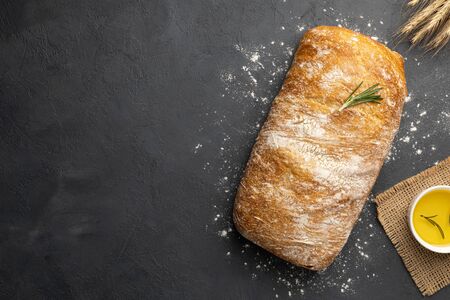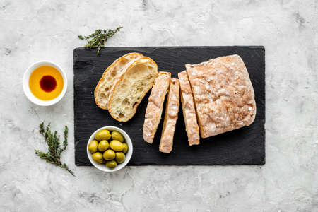 Italian ciabatta bread on black slate board with herbs and olives, Top view