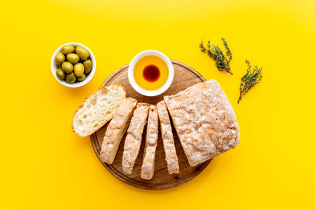 Ciabatta bread sliced, olives, olive oil. Closup.