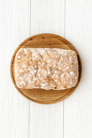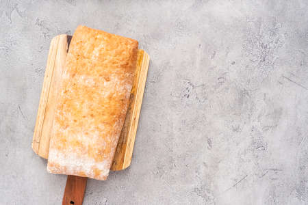 Homemade Ciabatta Bread on a wooden board, top view. Flat lay, overhead, from above.
