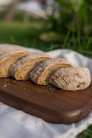 Composition of homemade white flour bread on wood board with white cloth napkin on the green grass . high quality photo