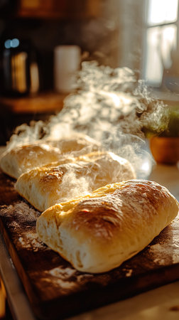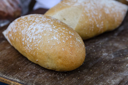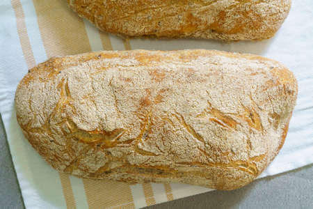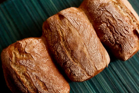 Freshly baked Italian Ciabatta bread. Home baked bread. Background with selective focus and copy space for text.