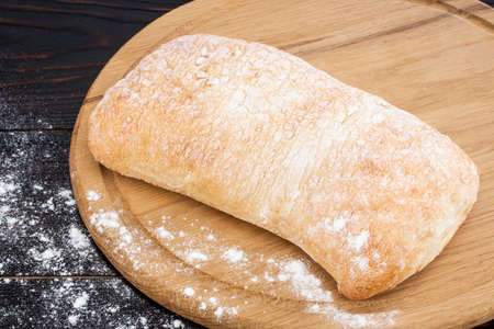 Loaf of ciabatta bread on a cutting board on the dark wooden table.