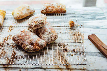 Freshly and warm baked bread rolls place on top marble counter for sell. Homemade by artisan.
