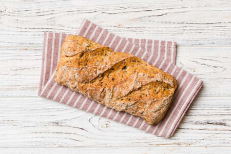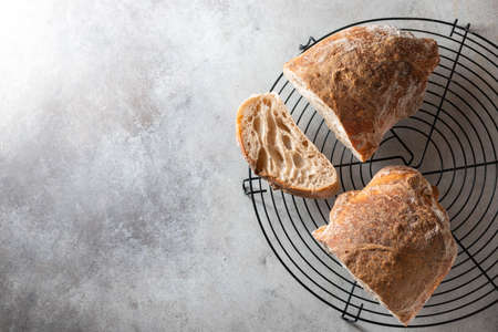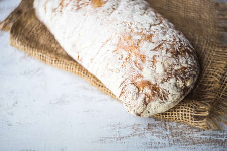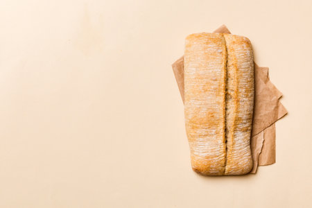 Fresh bread ciabatta loaf top view. Bakery background