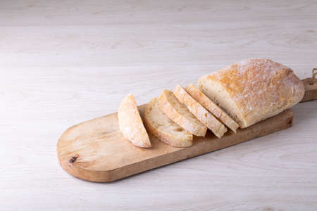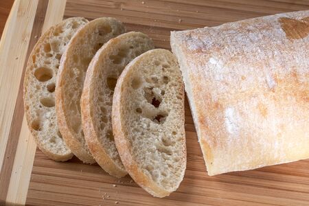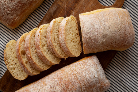 Sliced freashly backed bead ciabatta on cutting board, top view