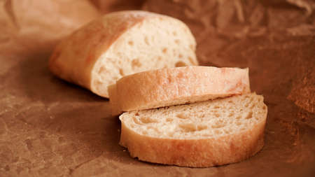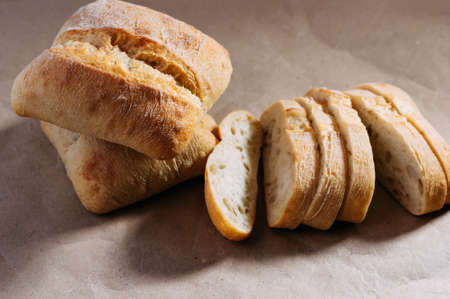 Ciabatta slices on craft paper. Fresh delicious pastries. Fresh homemade bread.