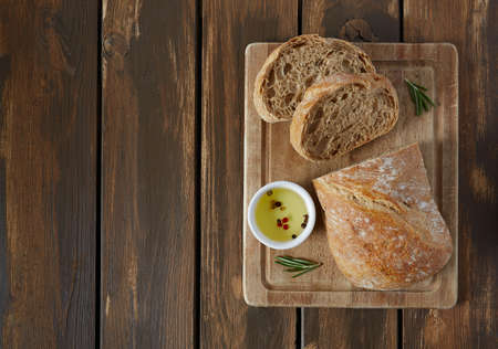 Fresh italian ciabatta bread cut slices with tomato, rosemary and olive oil on wooden background. Top view and copy space.