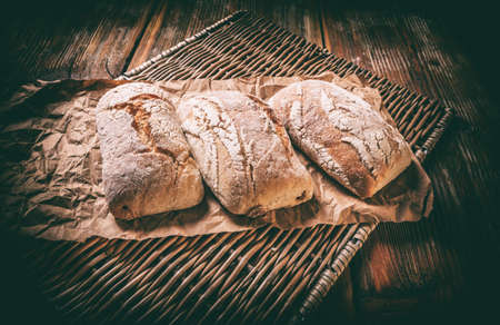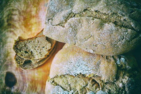 Loaf of homemade freshly baked bread on vintage surface, tinted photo