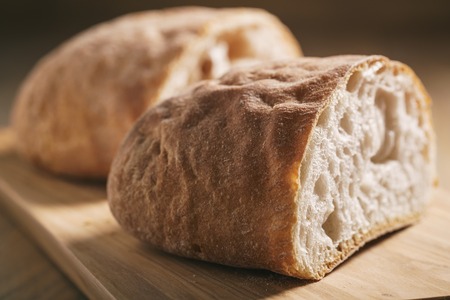 freshly baked ciabatta cut in half on olive board, closeup shallow focus