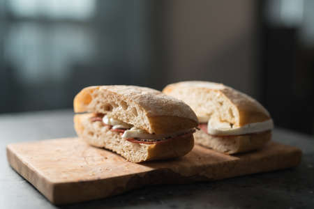 Ciabatta sandwiches with salami and mozzarella on olive wood board