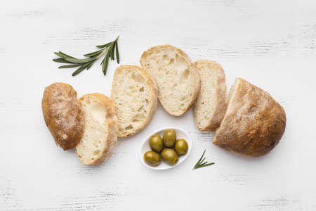 Sliced bread ciabatta with rosemary. Breakfast background