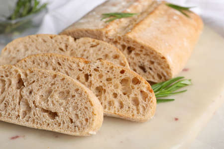 Cut delicious ciabatta with rosemary on white table