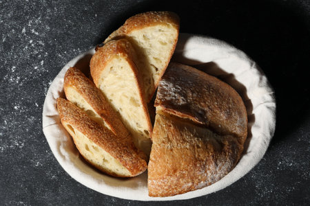 Sliced Italian ciabatta bread on black background. Top view, flat lay. Copy space for text.