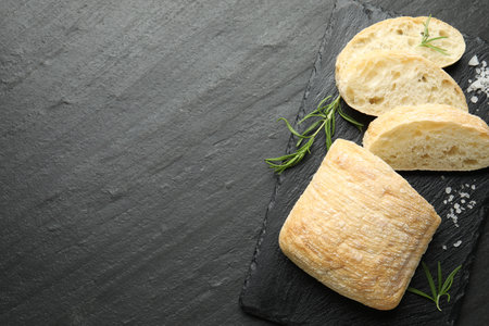 Cut crispy ciabatta, rosemary and salt on black textured table, top view. Space for text