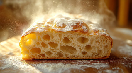 Freshly baked bread with a golden crust and airy texture displayed on a wooden surface. Generative AI