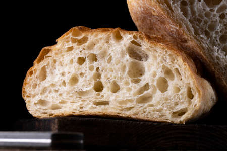 Italian ciabatta bread cut in slices on stone chopping board over dark backdrop.