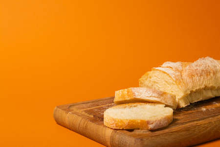 Sliced bread baguette on a wooden cutting board on a terracote color background. Close-up high quality photo.