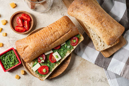 Plate with tasty sandwich, pesto sauce, tomatoes and cheese on light background