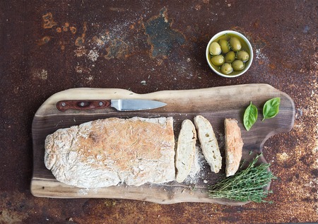 Freshly baked homemade ciabatta bread with olives, basil and thyme on walnut wood board over grunge rusty metal background, top view copy space