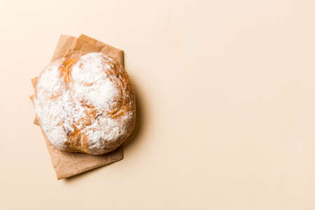 Freshly backed bread top view. Bakery background