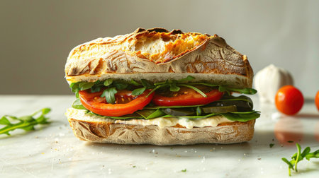 A delicious sandwich made with tomatoes, lettuce, and cheese is displayed on a table. This fast food dish is a perfect combination of ingredients and flavors
