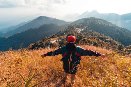 Asian young man in Scottish shirt and black hat hiking standing open arm happy at mountain peak above clouds and fog Hiker outdoor. Doi Luang Chiang Dao Chiangmai Province,In morning.