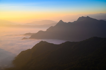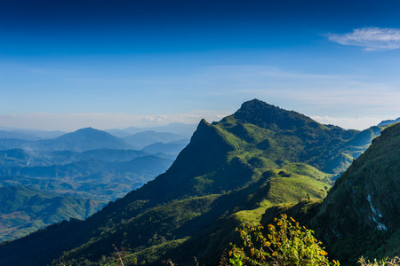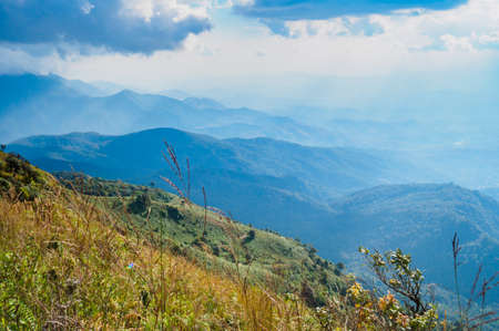 Scenic view of misty mountain in rain season at Doi Pha Hee, Chiang Rai, Thailand.