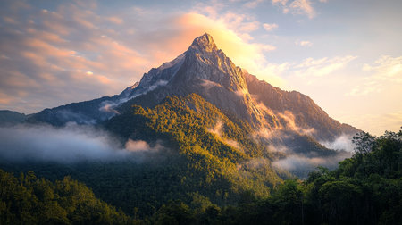 Majestic mountain peak in lush tropical rainforest