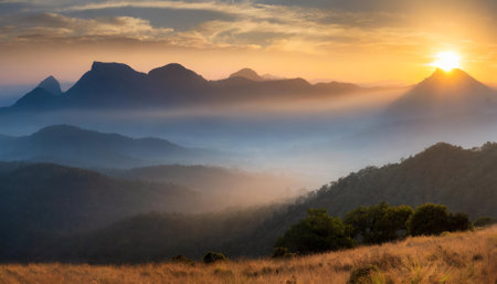A captivating sunrise graces a mountainous landscape, with golden light spilling across the peaks, soft clouds drifting above, and verdant valleys below. This breathtaking scene inspires