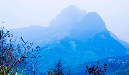 Large and highest mountain in Laos.Mountain are little blue.Bush branch at foreground.