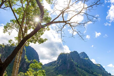 Tree at forest with sunlight sunrays or sunbeams star and mountain on the background.