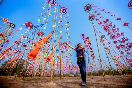 17 Feb 2019 , kalasin ThailandYoung women in Thailand travel festival Stand happy among the colors of the symbol of tourism in the northeastern region of Thailand.