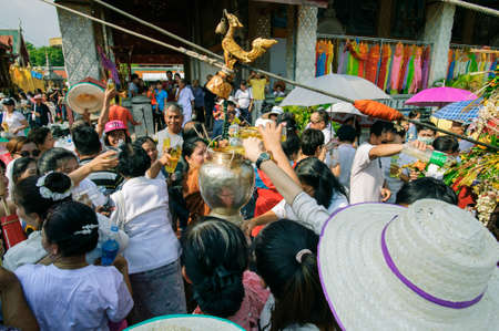 LAMPHUN, THAILAND - MAY 18, 2019 : People together pour water together to bathe Phra That Chedi Hariphunchai in Lamphun, Thailand.
