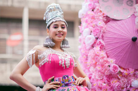 CHIANG MAI, THAILAND - FEBRUARY 08, 2020: Traditionally dressed woman in procession on Chiang Mai 44th Flower Festival in Chiang Mai, Thailand;