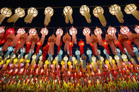 Rows of traditional paper lantern hanging on above during Yi peng (or Yee peng) festival in Wat Phra That Hariphunchai, Lamphun province, Thailand in the night time.