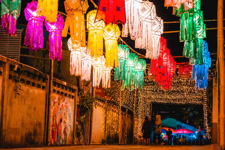 2019, November 22, Mae Hong Son, Thailand, - Beautiful Northern Thai style colorful lantern hanging on the street during the Loy Krathong festival.