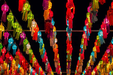 Colorful Loy krathong festival street lanterns in Thailand public night time.