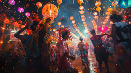A lively night festival showcases beautiful floating lanterns amidst a cheerful crowd gathered in celebration. The vibrant atmosphere is enhanced by flickering flames and a tropical backdrop.