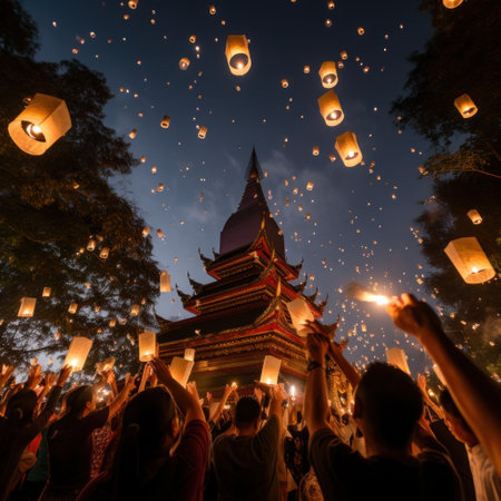 Lantern festival Yi Peng with blurred temple and crowd at twilight, background, AI generated