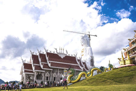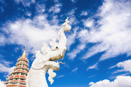 Chiang Rai Province Thailand - January 01, 2016: Naga Head Statue At Wat Huai Pla Kang With Blue Sky Background.