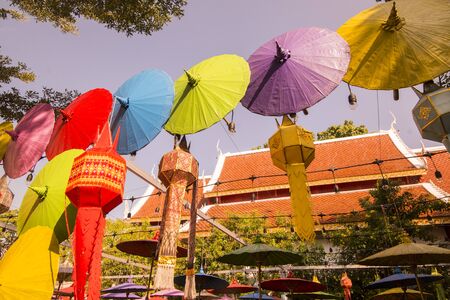 The Wat Pha Khao with thai umbrellas in the city of Chiang Mai at north Thailand. Thailand, Chiang Mai, November, 2019